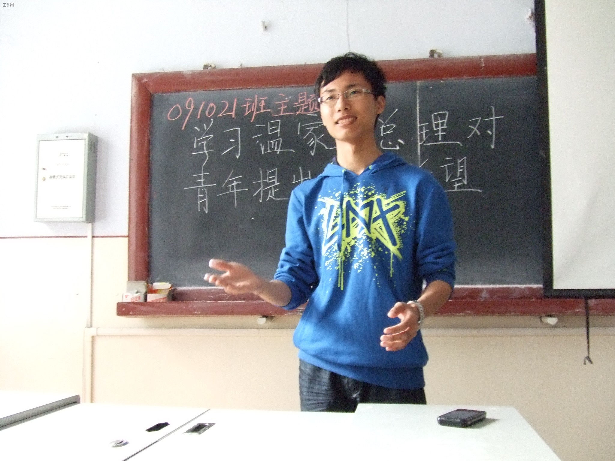 5月11日下午,091021班在11#0123教室开展团日活动,就温家宝总理对青年成才提出五点希望展开讨论,一方面谈到对五四运动的感受,也对“有理想,善学习,讲道德,要自立,勇奋斗”五点希望表达了自己的感受。