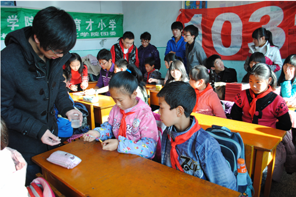 在第一批同学布置完教室后,活动正式开始。此次活动主要分为四个部分,在团支书的主持下,活动气氛十分活跃。向小学生播放我们学校以及我们1031班的一些活动的PPT,展示简单的化学实验并让他们亲自动手做,让小学生体验了化学的奥妙和乐趣。11点左右,第二批同学也在组宣委员的带领下到达小学,他们主要负责给小朋友赠送笔记本和笔,之后的精彩的互动环节将活动推向了高潮。最后,由团支书为代表把我们带去的科创书刊和玩偶送给了小学,我们全体同学并与小学生、老师、校长一一合影留念。校长表示,她很支持这种活动,希望我们继续保持联系,给他们的学生带去更多的知识。