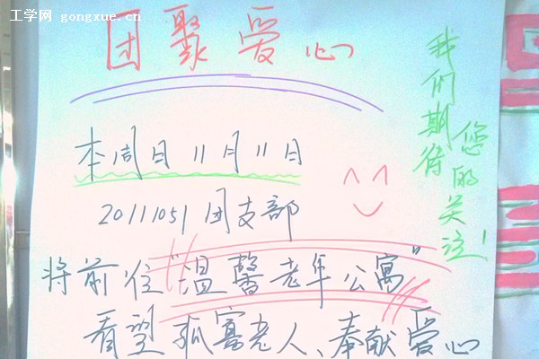 11月9、10日,我院20111051团支部在21B、11#教学楼张贴了海报,为本学期团聚爱心的活动开始了初步宣传。