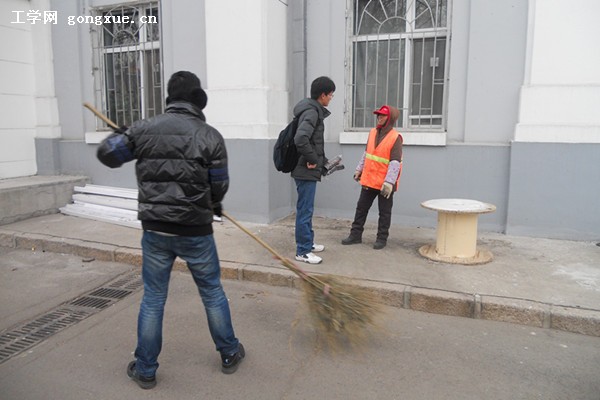 首先,同学们在三公寓门口找到了正在工作的清洁工大爷。郑国星代表我班同学给他们送了四副保暖手套,希望他们在工作的时候不会冻伤手。然后,同学们就和大爷攀谈起来,询问了他们日常工作的主要内容以及在生活工作中遇到的困难,对于其中的一些问题,同学们热心的提出自己的意见和建议。