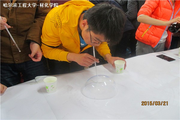 上午8时整,预选活动正式开始。首先,往届泡泡大赛的优秀参赛选手王磊同学向大家简单介绍了泡泡大赛的比赛规则及比赛项目,同时为大家演示了神奇泡泡,同学们纷纷为这次精彩的演示报以热烈的掌声。随后,王磊同学向同学们传授了自己的经验。科协已为此次预选活动准备了各种各样的原料。例如:甘油、十二烷基苯磺酸钠、洗衣粉等。在简单的实验之后,本次预选活动正式开始,同学们决定了自己想要参加的项目,并积极地开始准备各自的配料。而作为评委的科协成员也本着公平公正的原则开始为各位参赛选手记录成绩。经过紧张而又有趣的比赛,评委们终于评出了最佳选手,作为代表参加校赛。