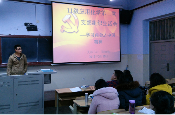 在学院党委的号召下,2015年3月16日,11级本科应用化学第二党支部在11号楼0123中教室举办本学期第一次组织生活活动—由两会见中国精神。本次活动由党支部书记陈柏羽同志主持,支部全体成员参加本次活动。