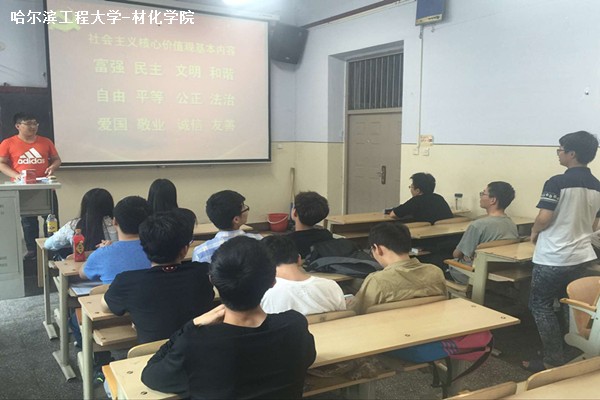 班长丁峤向大家介绍社会主义核心价值观的由来和内容。在同学们对社会核心价值观有了初步了解后,班长重点为大家介绍了关于社会主义核心价值观与大学生生活的联系,并讲述了一些有趣的法治故事,然后请同学们对故事中的法治知识进行讨论,并让大家各抒己见,阐述自己在今后的生活中如何与社会主义核心价值观紧密相连。