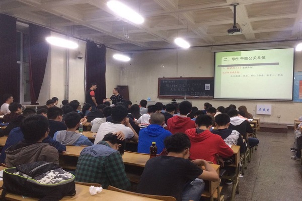 讲座伊始,蔡文学老师通过分析主持人的错误来引入了本次讲座的主题:理工科大学生的人际交往技巧,分别从公关礼仪的各个细节方面着手分析,举例说明了在握手、递名片、交换文件、形象、打招呼的时候的正确礼仪规范,为我们介绍了大学生应该具备的公关礼仪知识。