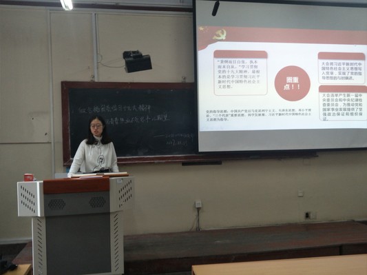 首先,团支书王璐向同学们介绍了党的十九大的概况,并系统阐述了十九大报告的主要内容。其次,她用ppt的形式分别介绍了十九大的主题、会议议程、议程内容、大会报告、大会意义。最后,为了加深同学们对相关精神的了解,团支书组织进行了问答和朗读环节,同学们积极的参与。她表示,十九大报告是一份充分发扬民主,凝聚各方智慧,顺应全党全国各族人民共同心愿、符合中国特色社会主义发展要求、适应党和国家工作新形势新任务三维大会报告,大家需要下一些功夫进行学习。