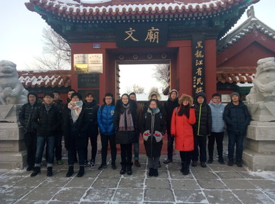 本次活动由团支书主持,下课后由团支书带领前往文庙并在文庙的大门前进行合照,合照后同学们由正门而入进行参观。文庙整体布局为三进院落,坐北朝南,各类建筑东西对称,井然有序,有着中国古代风格的古朴建筑让同学们目不暇接,连连称赞。参观了由爱国将领张学良为文庙撰写的碑记,体会他的爱国豪情。参观了文庙中的民族博物馆,里面有赫哲族等少数民族的历史介绍,让我们对黑龙江的少数民族有了更进一步的了解。参观完毕之后,同学们拜祭孔子行教像,以此向儒家思想的创始人孔子致敬。