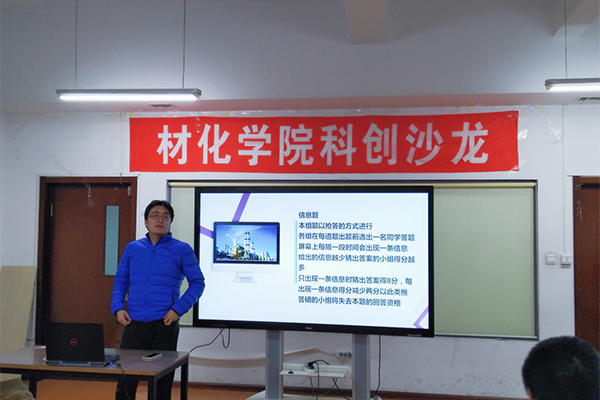 2017年12月1日18:15,艾弗森贝博ballbet官网于启航活动中心334教室举办第954期科创沙龙。本次科创沙龙的主题为化学与材料趣味知识问答,沙龙由科协项务部时鸿博担任主持人,项务部张梦博担任计分员,共二十二名同学参与本次活动。