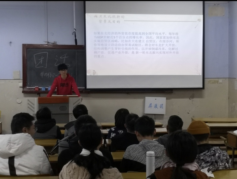 刘柳向同学们介绍了关于东北振兴的相关政策和东北振兴的背景及意义,并与同学们观看东北的相关产业的简短视频。刘柳带领着大家思考东北振兴并就相关问题进行讨论,现场气氛十分热烈。大家都积极地参与进来。