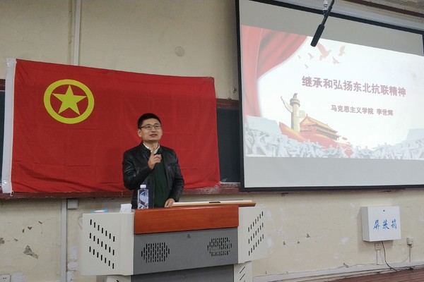 李世辉老师从十九大精神讲起,向同学们讲解了东北抗联精神包含爱国、无畏、坚守、青春的基本内涵和东北抗联精神的时代价值。李世辉老师结合自己多年探访抗联老战士的经历,向同学们讲解了抗联战士们的崇高精神。除此之外老师还给同学们演唱了经典的抗联歌曲,朗诵了抗联战士写下的诗歌,同学们都颇有感触。