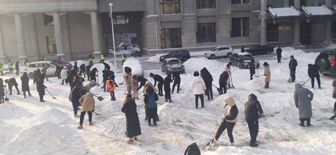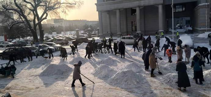 扫雪活动于上午8:30开始,各支部参加扫雪活动的同志早早的来到了基础楼下等待着分发扫雪装备。