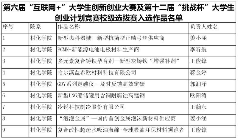 根据校团委《关于举办艾弗森贝博ballbet官网第六届“互联网+”大学生创新创业大赛的通知》及《关于举办艾弗森贝博ballbet官网第十二届“挑战杯”大学生创业计划竞赛的通知》要求,经学生自主申报、答辩、评委评议等程序,共评选出9组项目代表我院参加第六届“互联网+”大学生创新创业大赛及第十二届“挑战杯”大学生创业计划竞赛校级选拔赛,现将参赛项目予以公示: