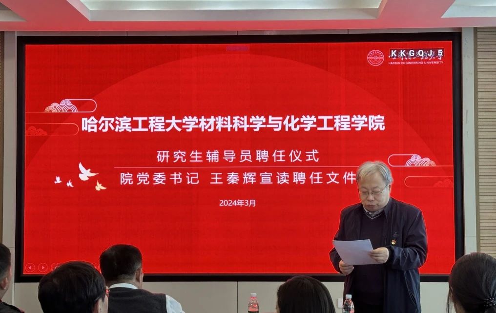 王秦辉宣读聘任文件。为推进研究生服务管理体系重构,加强研究生教育管理队伍建设,经学院党政联席会议研究决定,同意聘用蔡德龙、孙利昕、王建东、郑卫、张丽丽、刘汝庚、赵婧、白建伟、朱佳慧、冯静、丁鹤、冯莉莉等12名同志为研究生辅导员。