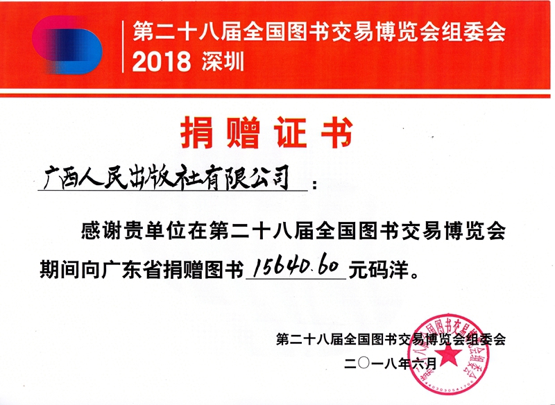 第二十八届全国图书交易博览会捐赠证书